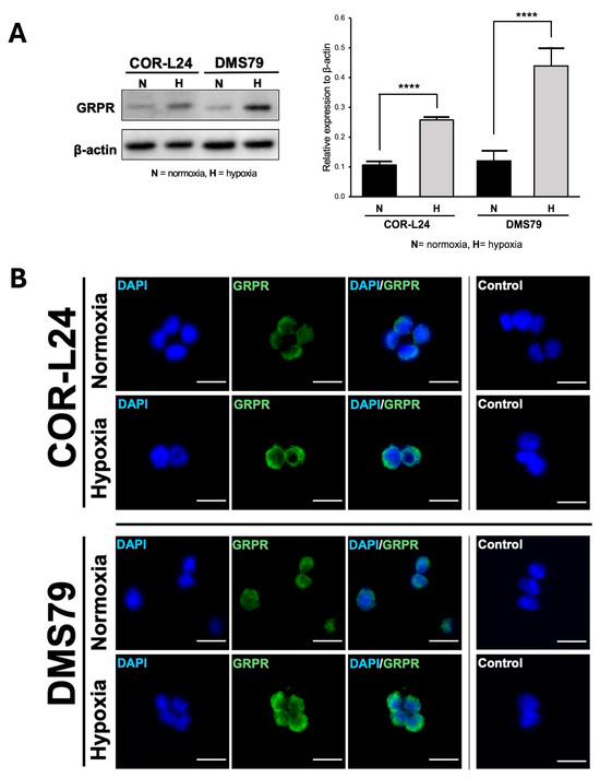 COR-L24 and DMS79 cells were seeded on Ibidi µ-Slides (Ibidi, Martinsried, Germany) and incubated under normoxia (20% O2) or hypoxia (0.1% O2) for 24 h. Cells were fixed with 3.5% formalin, blocked with 1% BSA, and incubated overnight at 4 °C with anti-GRPR antibody (1:200; Antibodies.com, Cambridge, UK). Alexa Fluor 488-conjugated secondary antibody (Thermo Fisher Scientific) was used for detection, and nuclei were counterstained with DAPI (1 µg/mL). Images were acquired using a 40×/0.80 Plan Apo objective on a 3DHistech Panoramic 250 Flash II slide scanner. ImageJ software (NIH, Bethesda, MD, USA) was used for analysis.
