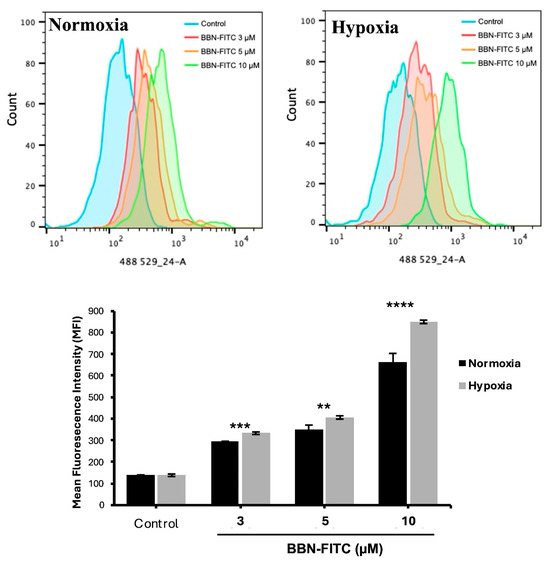 DMS79 cells were cultured under normoxia or hypoxia for 24 h, then incubated with bombesin-FITC (BBN-FITC; Peptide Protein Research Ltd., Fareham, UK) at 3, 5, or 10 µM for 30 min at room temperature. Cells were washed with PBS and analysed on a BD LSRFortessa X20 flow cytometer (BD Biosciences, San Jose, CA, USA). Data were gated to exclude debris and doublets, and only viable single cells were included in the analysis. Mean fluorescence intensity (MFI) values were calculated using FlowJo software, version 10.10 (BD Biosciences, San Jose, CA, USA).