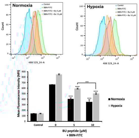 Competitive binding of BU peptide to GRPR under normoxic and hypoxic conditions. DMS79 cells were pre-incubated under normoxia and hypoxia for 24 h, followed by treatment with BU peptide (5–10 µM) for 1 h and incubation with 10 µM BBN-FITC for 30 min. Fluorescence intensity of BBN-FITC was analysed by flow cytometry. Data represent mean ± SD from three independent experiments (*** p < 0.001, **** p < 0.0001).
