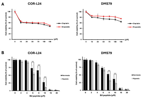 Cell viability was measured using the CellTiter-Glo assay (Promega, Madison, WI, USA). COR-L24 and DMS79 cells were seeded into 96-well plates. Cells were then pre-conditioned either under normoxia (20% O2) or hypoxia (0.1% O2) for 24 h, then returned to normoxia for treatment. Cells were exposed to BU peptide (0–20 µM), cisplatin (0–150 µM; Sigma-Aldrich), or etoposide (0–150 µM; Sigma-Aldrich) for 24 h. CellTiter-Glo reagent was added, incubated for 10 min, and luminescence was recorded on a Synergy H1 microplate reader (BioTek Instruments, Winooski, VT, USA).
