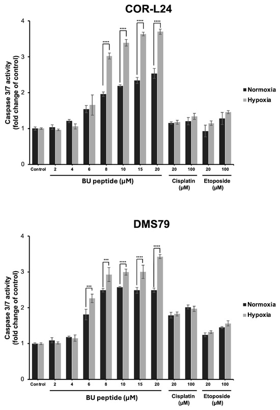 Caspase 3/7 activity in COR-L24 and DMS79 cells treated with BU peptide, cisplatin, and etoposide under normoxic and hypoxic conditions. Caspase 3/7 activity was measured in COR-L24 (top) and DMS79 (bottom) cells following 24 h treatment with BU peptide (2–20 µM), cisplatin, and etoposide (20–100 µM) under normoxia (20% O2) and hypoxia (0.1% O2). Activity levels were normalised to untreated controls and expressed as fold change. Data are shown as mean ± SD from three independent experiments (*** p < 0.001, **** p < 0.0001).