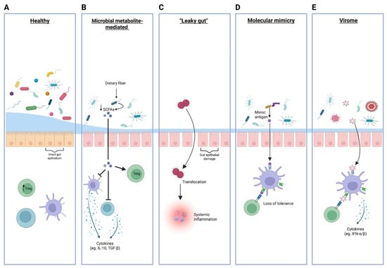 Schematic overview of mechanisms by which gut microbiota and virome influence immune regulation and the risk of autoimmunity in type 1 diabetes. Panels, from left to right, illustrate: (A) The healthy state, featuring a diverse commensal microbiota and intact gut epithelial barrier supporting regulatory T cell (Treg) induction and immune tolerance. (B) The role of microbial metabolites, where reduced dietary fiber fermentation leads to decreased production of short-chain fatty acids (SCFA; indicated by the downward arrow), resulting in impaired anti-inflammatory cytokine (IL-10, TGF-β) and Treg responses (C) ‘Leaky gut’, showing epithelial damage that permits microbial translocation across the intestinal barrier, leading to systemic inflammation. (D) Molecular mimicry, demonstrating activation of autoreactive lymphocytes via bacterial antigens resembling host proteins, resulting in loss of immune tolerance. (E) The virome, where viral sensing triggers type I interferon responses (IFN-α/β), potentially disrupting immune homeostasis and facilitating autoimmunity. Treg = regulatory T cell; SCFA = short-chain fatty acid; IFN-α/β = type I interferon.