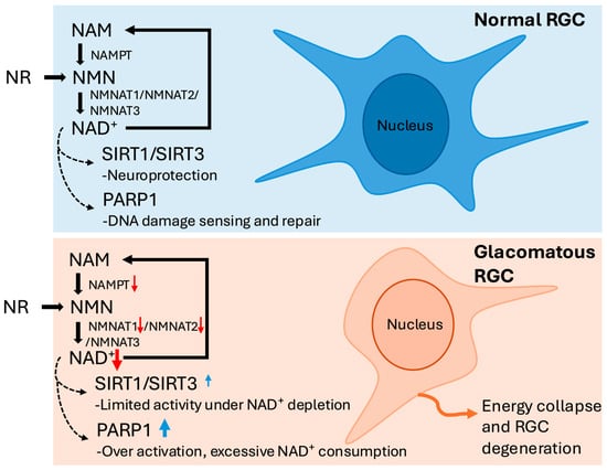 Schematic representation of the nicotinamide adenine dinucleotide (NAD+) salvage pathway in retinal ganglion cells (RGCs) under normal and glaucomatous conditions. Under normal conditions, nicotinamide (NAM) and nicotinamide riboside (NR) are converted to NAD+ through the sequential actions of nicotinamide phosphoribosyltransferase (NAMPT) and nicotinamide mononucleotide adenylyltransferases (NMNAT1–3). Adequate NAD+ levels sustain sirtuin 1/3 (SIRT1/SIRT3) activity for neuroprotection and support poly (ADP-ribose) polymerase 1 (PARP1) in physiological DNA repair. In glaucomatous RGCs, downregulation of NAMPT and NMNAT1/2, together with PARP1 overactivation, leads to NAD+ depletion and energy collapse. Although SIRT1/SIRT3 expression is increased, this reflects a compensatory response with limited activity under NAD+ deficiency, ultimately contributing to mitochondrial dysfunction and RGC degeneration. Red ↓ indicates decreased expression or activity; blue ↑ indicates compensatory or increased expression.