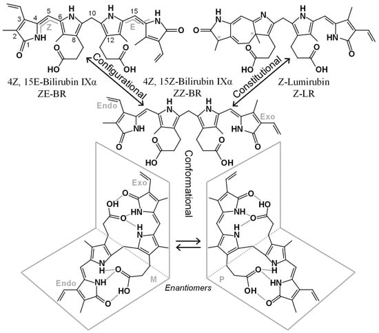 Constitutional isomers share the same molecular weight and chemical formula but differ in the arrangement of the atoms within the structure. Although synonymous with “structural isomer”, the latter term has been used somewhat arbitrarily in the bilirubin literature, whereas “constitutional isomer” is the designation recommended by the IUPAC []. During PT, the constitutional isomer LR, also known as cyclobilirubin, is formed. LR is believed to be the most readily excreted isomer formed during PT. It occurs in two different configurational forms, Z-LR and E-LR, each possessing stereogenic centers that give rise to enantiomeric pairs (see Figure 1). Other constitutional isomers, such as BR IIIα and BR XIIIα, are not products of heme catabolism but can arise through the conversion of BR IXα. This conversion is hampered by the presence of albumin [] resulting in low in vivo levels of BR IIIα and BR XIIIα with questionable clinical relevance. Slightly higher yet still low levels have been reported in commercial reference materials [], which may introduce analytical bias in end-user assays.
