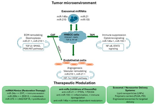 Schematic representation of miRNA-mediated crosstalk within the tumor microenvironment of HNSCC and potential therapeutic modulation strategies. Exosomal miRNAs (miR-21, miR-146a, miR-155, and miR-210) are released by stromal and immune cells, mediating bidirectional communication with HNSCC cells. Upregulated miRNAs promote extracellular matrix (ECM) remodeling and desmoplasia in cancer-associated fibroblasts (CAFs) via TGF-β/SMAD and PI3K/AKT pathways, immune suppression and cytokine signaling in tumor-associated macrophages (TAMs) through NF-κB and STAT3 pathways, and angiogenesis in endothelial cells through the HIF-1α/VEGF pathway. Central HNSCC cells are regulated by multiple signaling axes (PI3K/AKT, MAPK, TGF-β, and NF-κB), while exosomal miRNAs reinforce intercellular signaling across the tumor microenvironment. Therapeutic approaches include miRNA mimics (miR-34a, miR-200c, miR-375) to restore tumor-suppressor activity, anti-miRs (anti-miR-21, anti-miR-155, anti-miR-146a) to inhibit oncogenic miRNAs, and exosomal/nanocarrier delivery systems (LNPs, PLGA, PEI) for targeted administration.