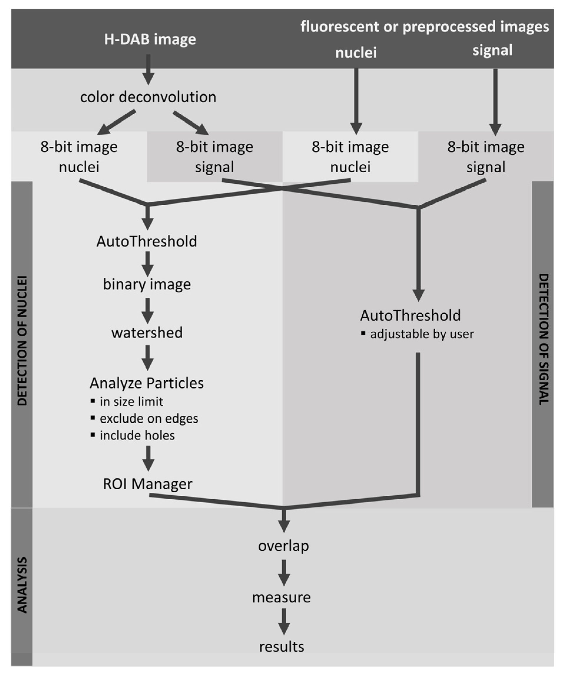 11], which was originally developed for the detection of viral infections and reports the percentage of cells with nuclear positivity, is used. The macro creates masks of nuclei and masks of signals, and the results are generated by performing an AND operation on the binary images. However, it is not possible to determine the intensity. The aim of this study is to present LoQANT, an open and freely available ImageJ plugin for reliable and efficient quantification of nuclear protein staining, and to demonstrate its applicability by analysing ligand-induced changes in the nuclear localisation of peroxisome proliferator-activated receptor alpha (PPARα) and phosphorylated p38 (phospho-p38) in HT-29 cells.