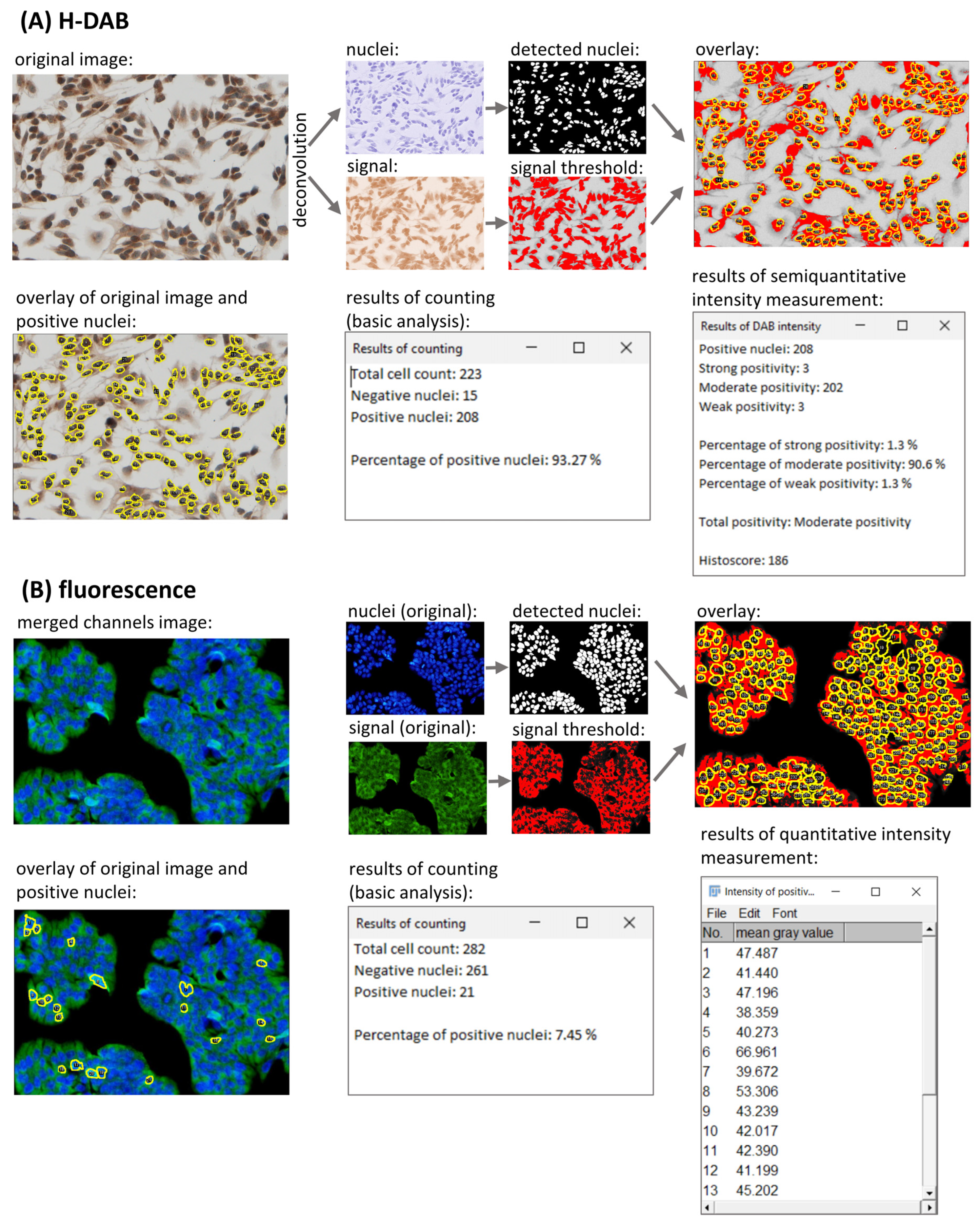 10], suitable for automated analysis, uses the DAB_IHC macro to measure the count and area of a total selection (haematoxylin and DAB+) and positive selection (DAB+ only), as well as positive intensity. Images are analysed sequentially for total and positive selections, but the macro does not resolve subcellular localisation of the antigen. For fluorescent staining, QuantIF [