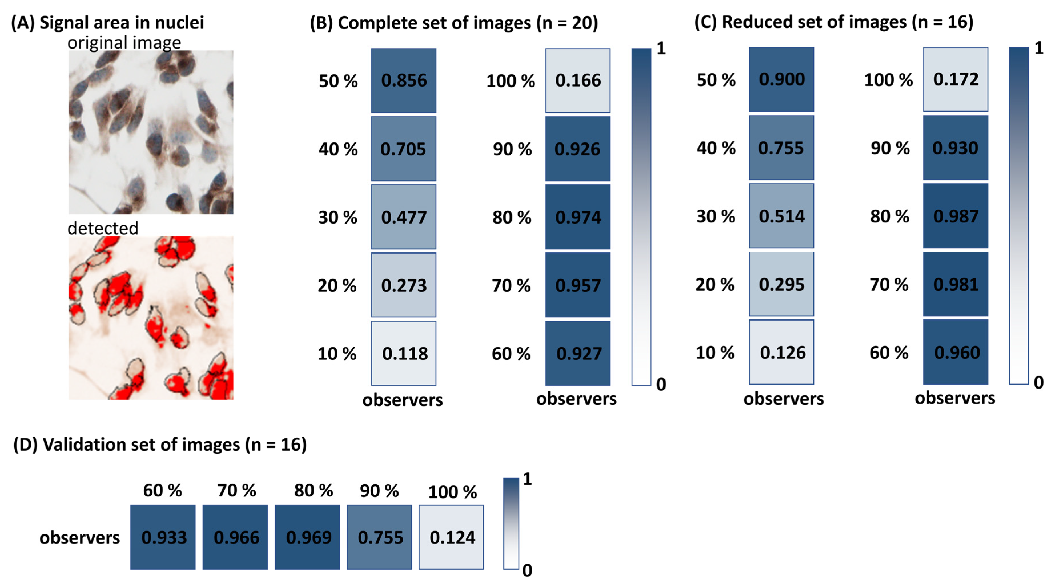 To validate the 80% nuclear area coverage threshold used to define nuclear positivity, a validation set of 15 different images was evaluated by observers O1, O2, O3, and O4 (observers O5 and O6 were unavailable). The same validation sample set was then processed in LoQANT using nuclear coverage thresholds of 60%, 70%, 80%, 90%, and 100%. The size of the nuclei was limited to 300–1200, the nuclei and signal segmentation algorithm were set to “Default” (as described previously). The reliability (ICC) between human consensus (mean of human observers for each image) and LoQANT was calculated. Moreover, mean difference, standard deviation (SD), 95% confidence interval (CI) of the mean difference, and Pearson correlation coefficient (r) between human consensus and LoQANT were also evaluated.
