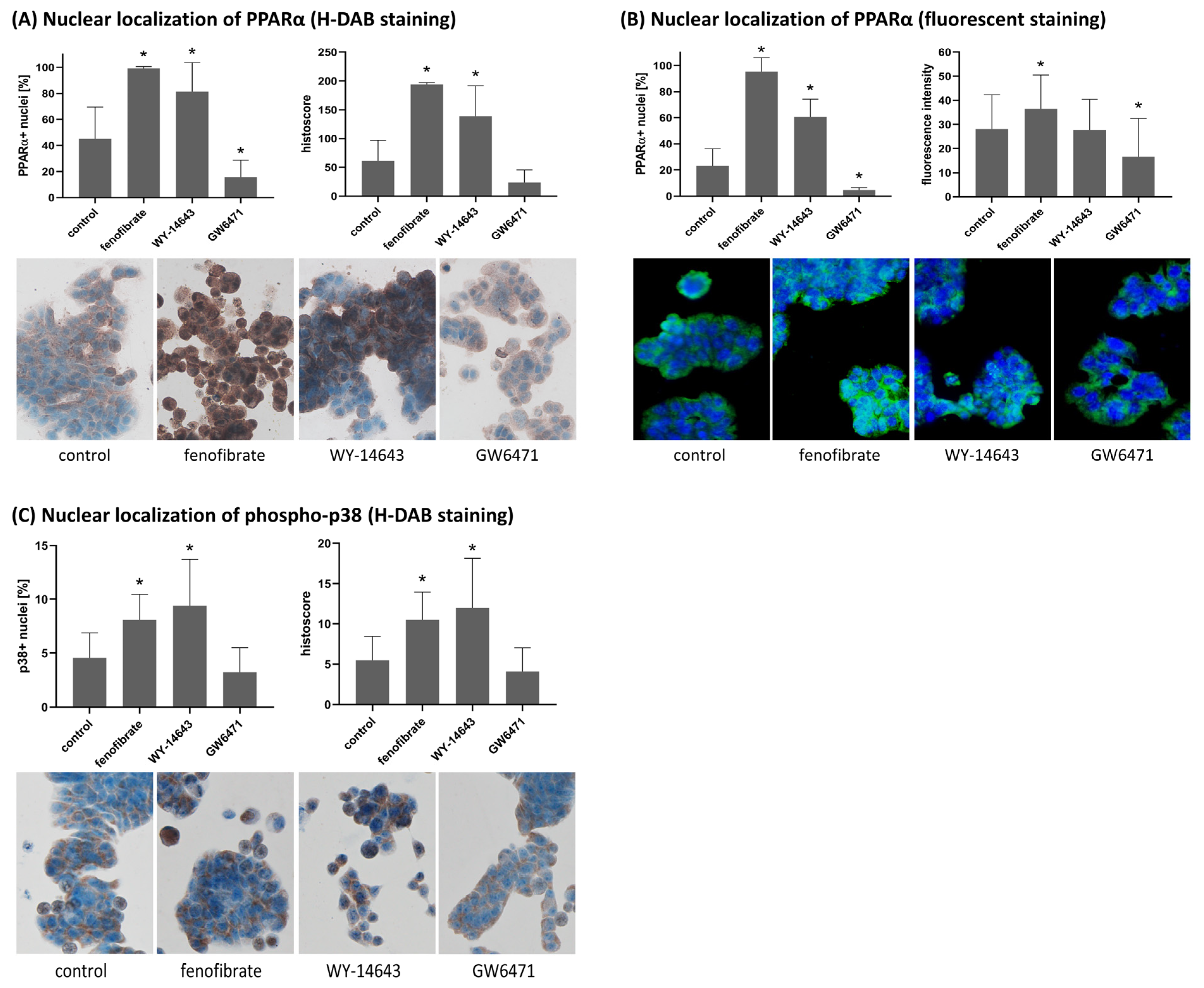 40]. LoQANT analysis showed that nuclear phospho-p38 increased after fenofibrate and WY-14643 treatment but was unaffected by GW6471, suggesting a link between PPARα activation and p38 nuclear translocation. This highlights a potential link between PPARα activation and p38 nuclear translocation [