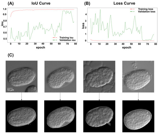 ResU-Net performance diagram. (A) ResU-Net IoU results diagram. The IoU scores are used to evaluate accuracy. The green line represents the IoU score for the validation set, while the red line indicates the IoU score for the training set. (B) ResU-Net loss diagram. The green line represents the loss for the validation set, while the red line indicates the loss for the training set. (C) ResU-Net also performs well in deliberately prepared images with severe noise. From left to right, images show: mixed with other embryos in the frame, focus issues, presence of bubbles around the embryo, and presence of tissue debris around the embryo. Scale bar: 10 μm. The top row shows the original images, whereas the bottom row displays the processed results.
