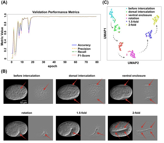 ResNet performance diagram. (A) ResNet validation performance diagram. Different colors of blue, orange, green, and red, represent “Accuracy”, ”Precision”, ”Recall”, and “F1-Score”, respectively. (B) Gradient-weighted Class Activation Mapping (Grad-CAM) reveals that the image classification model can accurately capture the key semantic features of each embryonic stage. On the left side of each subcategory is the embryo image after ResU-Net processing, whereas the right side displays the image following Grad-CAM analysis. Red arrows indicate areas with high weightings. Scale bar: 10 μm. (C) UMAP visualization of feature representations from the validation dataset using the ResNet model. Each point represents a single embryo image, colored according to its predicted developmental stage. Black lines indicate the correct developmental trajectory of C. elegans, illustrating the temporal order of embryogenesis.
