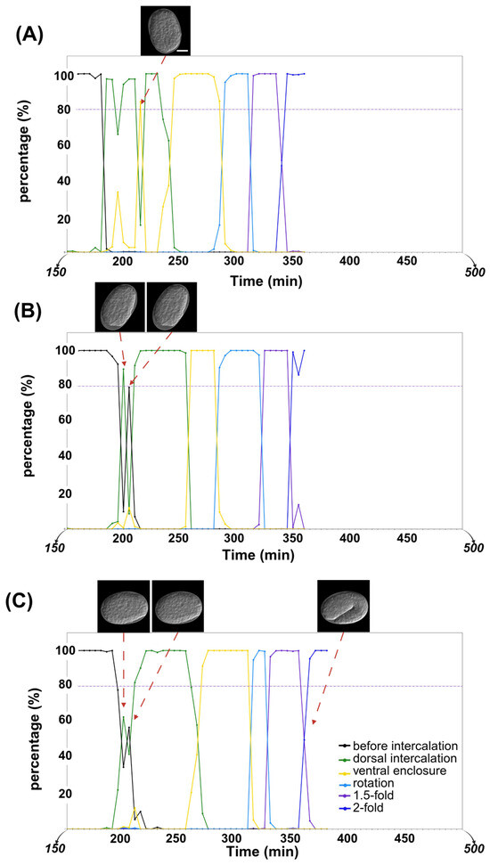 Screened timeline examples that show misclassification and the two observed patterns of transition periods. Scale bar: 10 μm. Different colors of black, green, yellow, sky blue, purple, and dark blue represent “before intercalation”, “dorsal intercalation”, “ventral enclosure”, “rotation”, “1.5-fold”, and “2-fold” stages, respectively. (A) Misclassification in the timeline. (B) Oscillating between high probabilities for two different stages during transition period. (C) Maintaining a low probability during transition period.