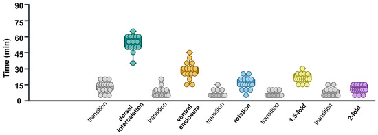 We also analyzed and compared the duration of all transition periods from dorsal intercalation to the 2-fold stage within the generated timeline but did not observe any significant developmental delay.
