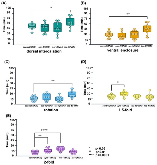 Calculated and compared duration of embryonic development in each stage and, successfully defined specific embryonic stages affected by RNAi treatment of ajm-1, tes-1, and leo-1. ajm-1(RNAi) was delayed in the 1.5-fold, 2-fold stages and, transition periods; tes-1(RNAi) was delayed in the 2-fold stage; leo-1(RNAi) was delayed in dorsal intercalation, ventral enclosure, and rotation stages. control(RNAi): N = 16; ajm-1(RNAi), tes-1(RNAi), and leo-1(RNAi): N = 10; * p < 0.05; ** p < 0.01; **** p < 0.0001; unpaired Student’s t-test. (A) dorsal intercalation. (B) ventral enclosure. (C) rotation. (D) 1.5-fold. (E) 2-fold. Each dot represents the time required by a single embryo to undergo each specific embryonic stage.