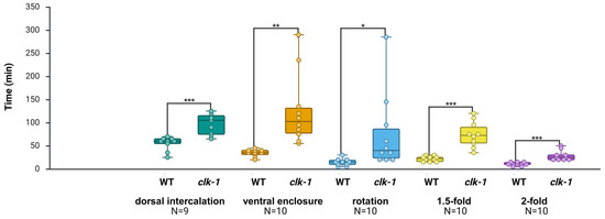Calculated and compared duration of embryonic development at each stage in WT and clk-1(e2519) mutant embryos. The analysis successfully identified specific embryonic stages affected by clk-1. The clk-1(e2519) mutant exhibited severe developmental delays across all five epidermal stages examined. * p < 0.05; ** p < 0.01; *** p < 0.001; unpaired Student’s t-test. Each dot represents the duration of a single embryo for the corresponding developmental stage. Dorsal intercalation: (WT: N = 9; clk-1: N = 9); ventral enclosure: (WT: N = 10; clk-1: N = 10); rotation: (WT: N = 10; clk-1: N = 10); 1.5-fold: (WT: N = 10; clk-1: N = 10); 2-fold: (WT: N = 10; clk-1: N = 10).