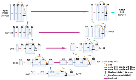 The segmentation model used in this study was a modified U-Net [28,29] architecture, referred to here as a ResU-Net, which integrates residual connections into both the encoder and decoder blocks, thereby improving gradient flow and training stability. The model takes single-channel grayscale images of size 256 × 256 pixels as input. Each encoder and decoder stage consists of two residual blocks, with each block comprising two 3 × 3 convolutional layers, followed by batch normalization and ReLU activation. Max pooling layers were employed for spatial downsampling, and transposed convolutions were used for upsampling. Skip connections were applied between corresponding encoder and decoder layers to preserve spatial information. The number of feature maps doubled after each downsampling and halved during upsampling. A final 1 × 1 convolution layer was used to project the output to a single-channel segmentation mask (Figure 8).