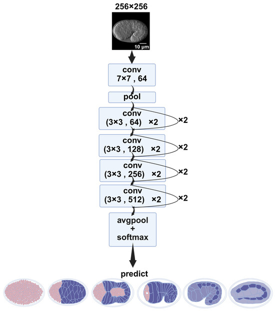 The classification model was based on ResNet-18 [30] from torchvison (v0.15.0). The input images were 256 × 256-pixel single-channel grayscale images obtained from the ResU-Net. The classification task involved six distinct developmental stages of the embryo, with 400 labeled images per stage, yielding a total of 2400 annotated images. Each image corresponded to a precisely staged embryo (Figure 9).