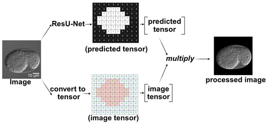 Schematic diagram of using ResU-Net processing to extract the embryonic region in the image. After passing through ResU-Net, a tensor containing only 0 s and 1 s is produced. This predicted tensor is then multiplied by the original image tensor to produce the processed image. Scale bar: 10 μm.