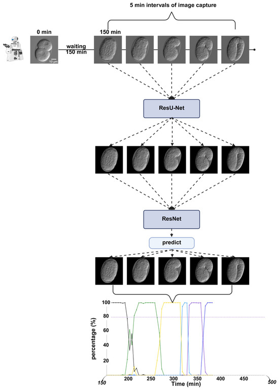 Key temporal analysis experimental workflow. The time-lapse image dataset is first processed by ResU-Net, followed by input into ResNet for embryonic stage prediction. Finally, the predicted timeline results are visualized. Scale bar: 10 μm.
