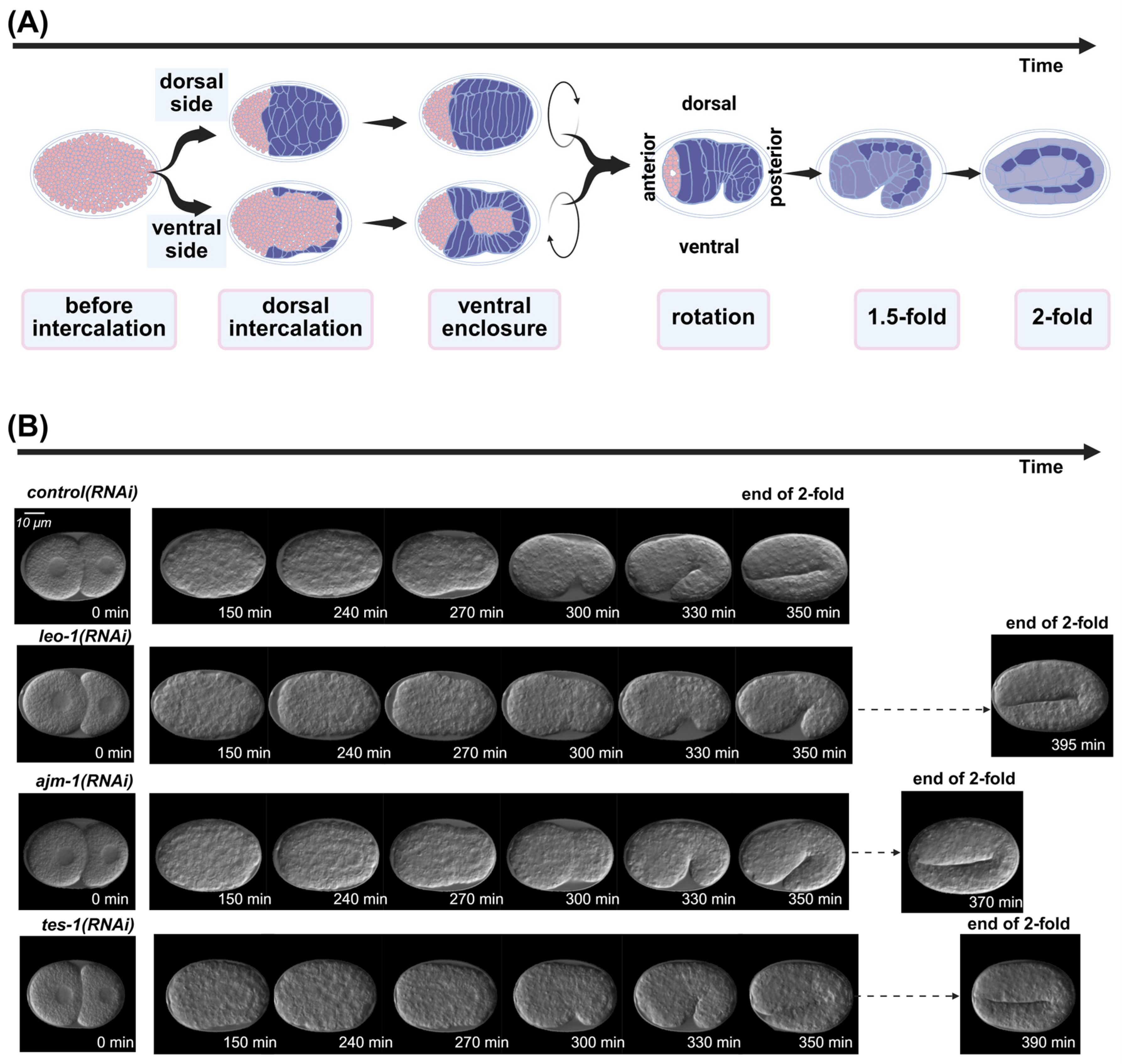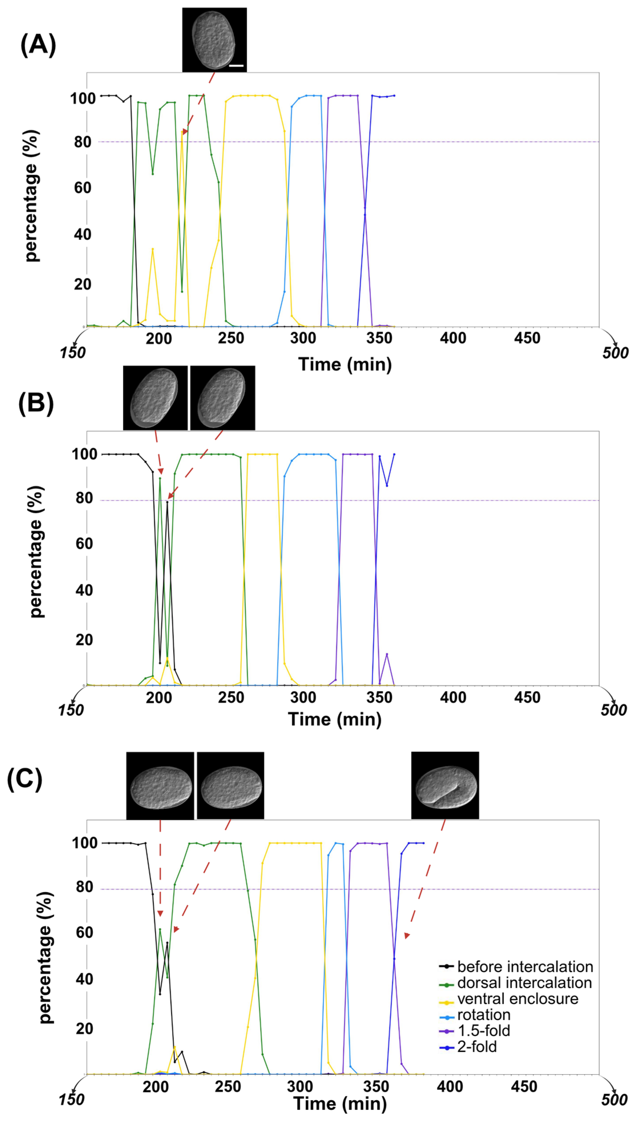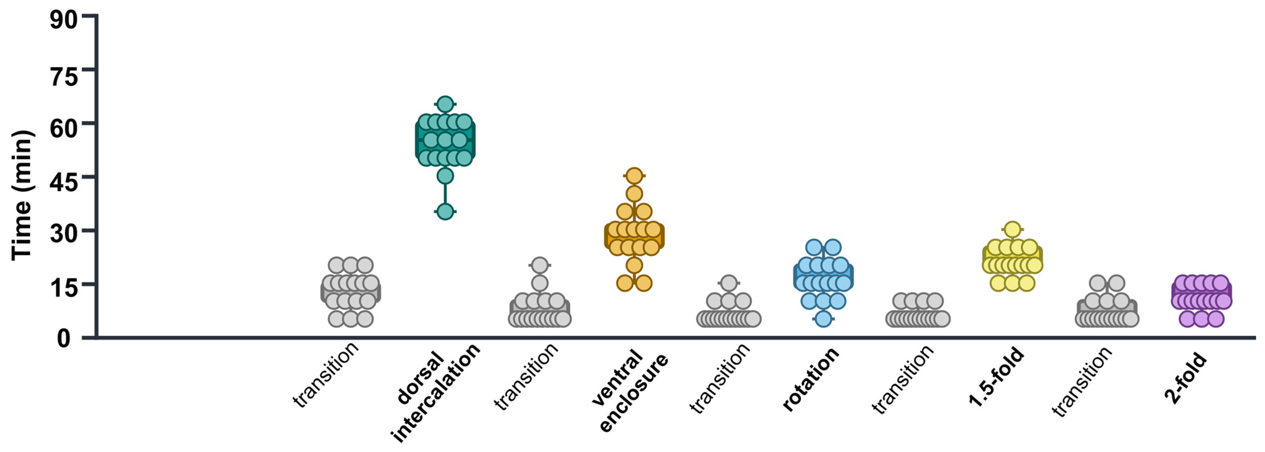 | Strains | Dorsal Intercalation (min) | Ventral Enclosure (min) | Rotation (min) | 1.5-fold (min) | 2-fold (min) |