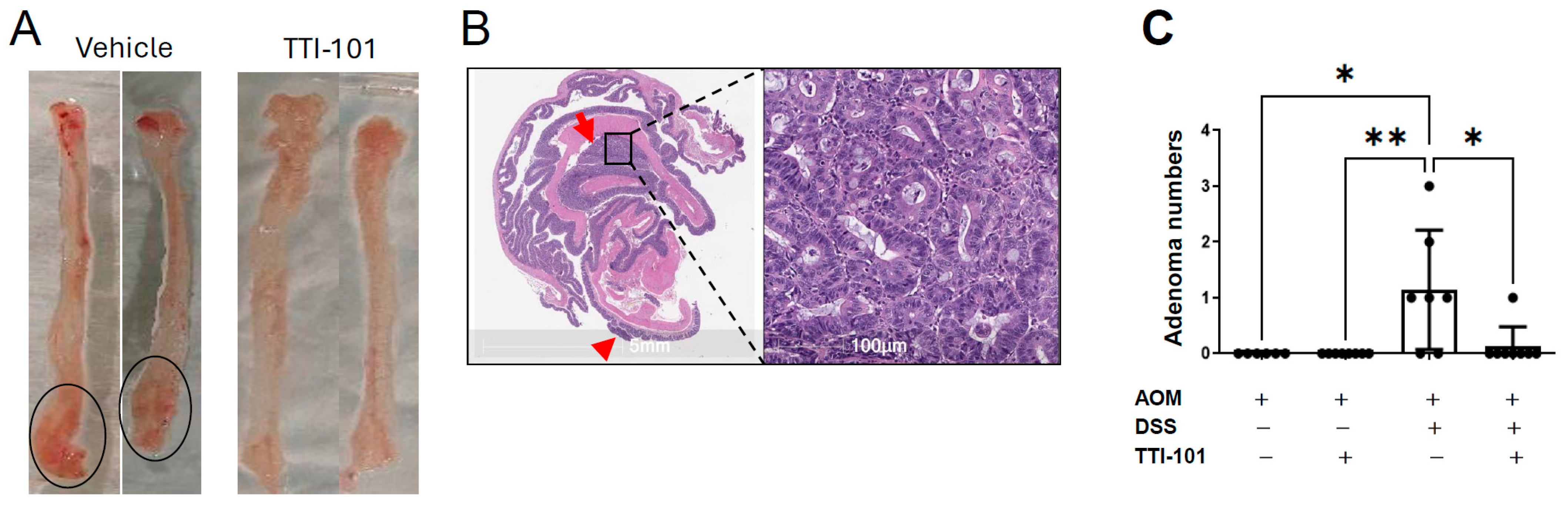 2.1. TTI-101 Reduced Adenoma Numbers in the AOM-DSS Mouse Model of Colitis-Induced CRC and Was Well Tolerated