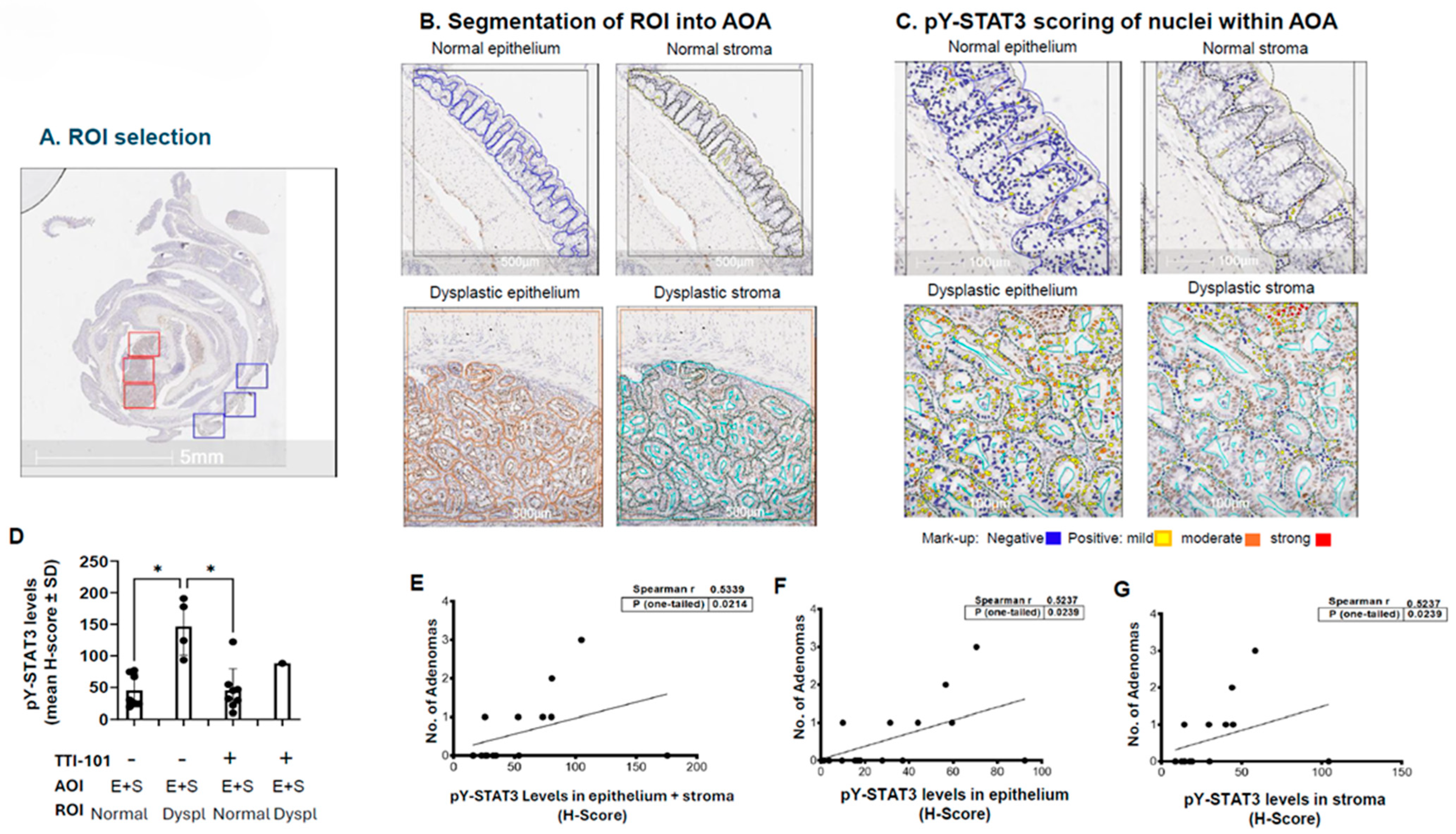 2.2. Levels of pY-STAT3 Were Increased in Dysplastic vs. Normal Colon Mucosa of AOM-DSS Mice and Correlated with Adenoma Number