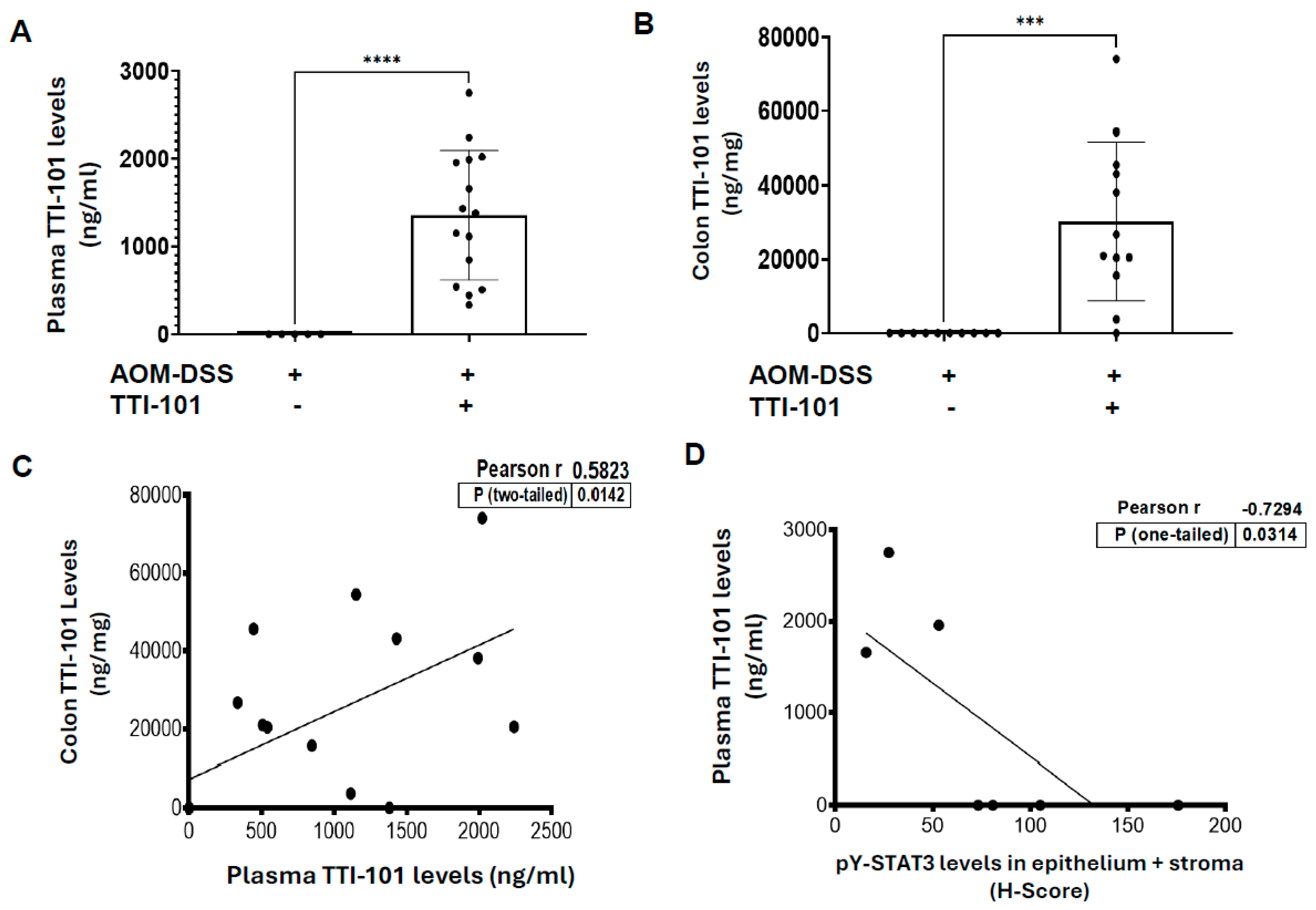2.3. TTI-101 Was Detected at Pharmacologically Relevant Levels in Plasma and Colons of TTI-101-Treated AOM-DSS Mice; TTI-101 Levels Were Inversely Correlated to pY-STAT3 Levels