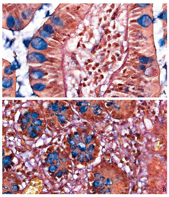Sections of human ileum in Pentachroma O-H, illustrating the morphology of mucosal lymphoid infiltration of the mucosa, at different magnifications: (A) Intestinal villi in mixed longitudinal/transverse sections (200×), showing typical intestinal epithelium, circumscribing heavily augmented lamina propria cores: scarce loose connective tissue stroma with extensive lymphoid infiltration and immune cell accumulation/aggregation. The same blue–black nuclear tinctoriality is maintained throughout the invasive immune cellularity. (B) Overview (100×) of the transition between mucosa and submucosa, with the same architecture and tinctoriality as previously described, yet showing a denser cellularity in the lamina propria, due to abundant lymphoid infiltration: numerous blue–black nuclei, clustered within a diminishing loose connective tissue stroma, overwhelmed by immune cell accumulation. Scale bar: (A)—0.060 mm; (B)—0.100 mm.