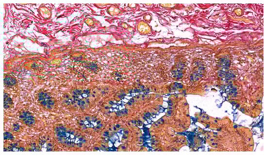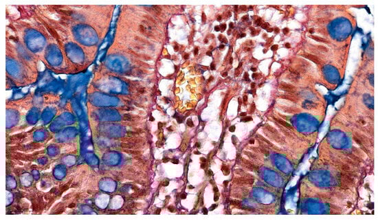 Current multi-component staining methods, such as Masson’s trichrome and Movat’s pentachrome, offer improved tissue differentiation but remain suboptimal for intestinal tissue analysis. Masson’s trichrome, for example, uses three dyes to differentially stain muscle, collagen, fibrin, and erythrocytes—classically producing black nuclei, red muscle/cytoplasm, and blue (or Gomori green) collagen fibers [,]. This trichrome technique is routinely used to assess fibrosis (excess collagen) or to distinguish smooth muscle in tumors []. However, it does not specifically identify mucins or elastic fibers.