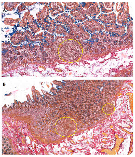 Sections of human ileum in Pentachroma O-H, illustrating the morphology of Peyer’s patches (yellow circles), at different magnifications: (A) Transition between mucosa and submucosa (100×)—Intestinal villi in longitudinal and transverse sections, showing typical architecture of the intestinal mucosa: columnar absorptive epithelium and goblet cells with acidic mucins, distributed across a basement membrane, with a central loose connective tissue axis (lamina propria) and a clearly highlighted muscularis mucosa (at the interface between the mucosa, i.e., the loose connective tissue of the lamina propria, and the submucosa, i.e., dense irregular connective tissue). Centrally, just above the muscularis mucosa, a Payer’s patch is visualized at the base of the mucosa, extending upward into the lamina propria, i.e., well-organized gut-associated lymphoid tissue (GALT): B-cell-rich germinal centers within the aggregated follicles and T-cell-rich parafollicular zones between them. Comprised mainly of lymphocytes, with scant cytoplasm, and very scarce follicular stroma, this patch appears as a pale area with dense cellularity. Lymphoid cell nuclei appear blue–black (Mayer’s hematoxylin), condensed towards the center of the patch, while the peripheral border is faded, without a clear distinction of the follicle-associated epithelium (FAE). (B) Wide overview (50×) of the transition between mucosa and submucosa—Architectural elements remain pervasive and clearly visible: the same consistent staining patterns for the mucosa (epithelium lining, lamina propria, and muscularis mucosa) and subjacent submucosa (extensive red collagen matrix, intertwined with dark purple elastin fibers, holding an extensive and distinctively yellow-stained vascular network). At the level of this mucosa-to-submucosa interface, sitting just above the muscularis mucosa, two neighboring Payer’s patches can be clearly seen, extending upward into the lamina propria (poorly bordered pale areas with numerous blue–black nuclei). Scale bar: (A)—0.100 mm; (B)—0.200 mm.