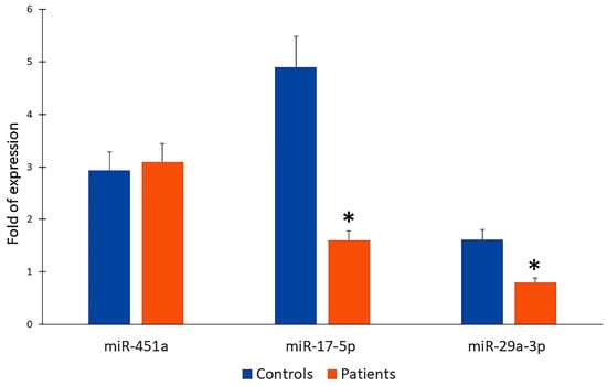 MiR-451a, miR-17-5p, and miR-29a-3p qRT-PCR in controls and patients; * p < 0.005.