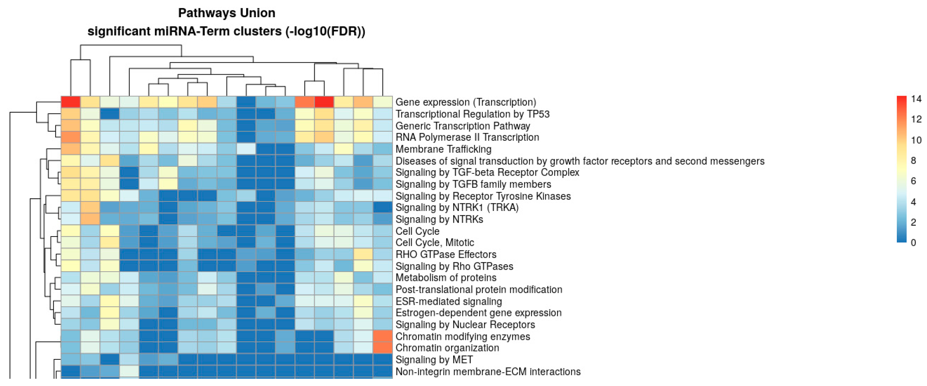 | Signaling by TGFB family members | 104 | 11 | hsa-miR-17-5p hsa-miR-20a-5p hsa-miR-22-3p hsa-miR-24-3p hsa-miR-25-3p hsa-miR-26a-5p hsa-miR-26b-5p hsa-miR-27a-3p hsa-miR-92a-3p hsa-miR-125b-5p hsa-miR-126b-5p | 7.5 × 10−61 | 4.89 × 10−59 |
