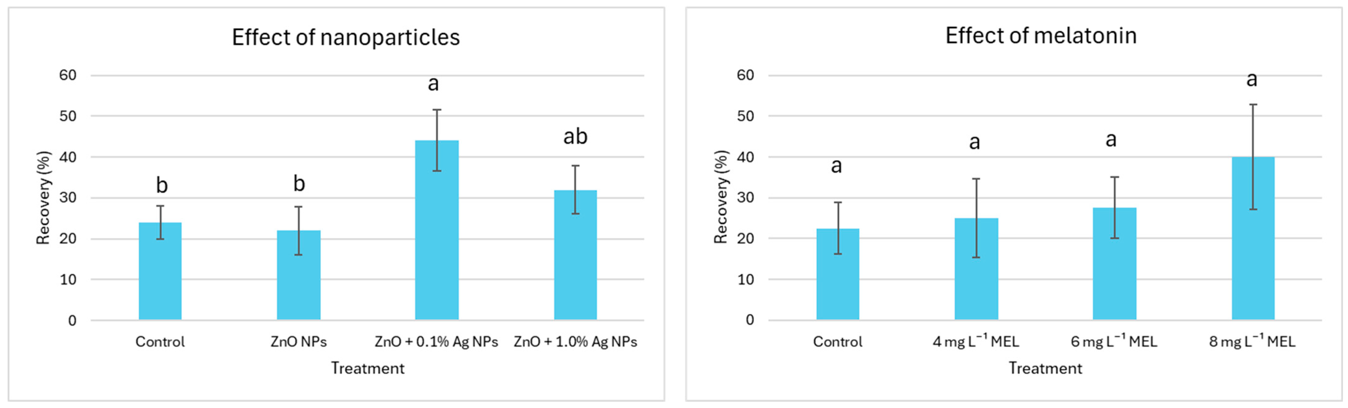 2.1. Effect of Nanoparticles and Melatonin on the Explant Recovery