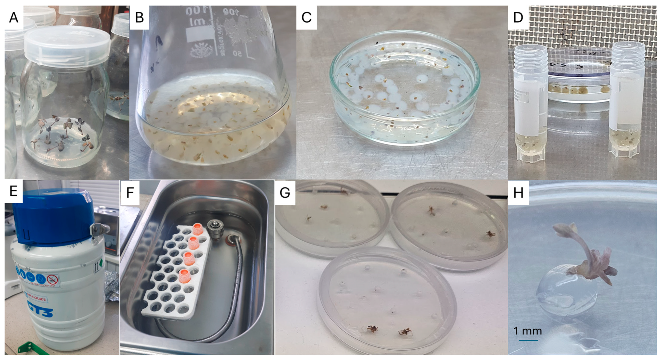 - Popova, E.; Kulichenko, I.; Kim, H.-H. Critical Role of Regrowth Conditions in Post-Cryopreservation of In Vitro Plant Germplasm. Biology 2023, 12, 542. [Google Scholar] [CrossRef] [PubMed]