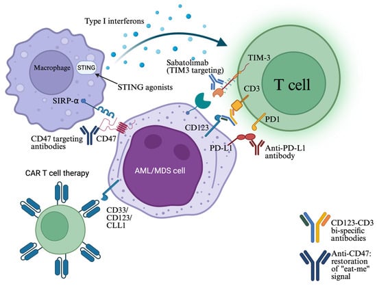 - Barakos, G.P.; Hatzimichael, E. Microenvironmental Features Driving Immune Evasion in Myelodysplastic Syndromes and Acute Myeloid Leukemia. Dis. Basel Switz. 2022, 10, 33. [Google Scholar] [CrossRef]