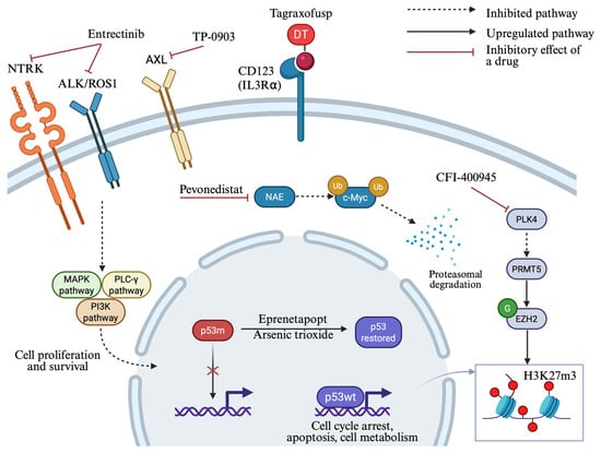 - Tognon, C.; Mishra, S.; Kaempf, A.; Park, B.; Joshi, S.K.; Huang, A.; Kurtz, S.E.; Sax, L.; Eide, C.A.; Johnson, K.; et al. Phase 1 Trial Testing the Novel Combination Therapy of Entrectinib and ASTX727 in TP53 Mutated Relapsed/Refractory Acute Myeloid Leukemia Patients. Blood 2024, 144, 1498. [Google Scholar] [CrossRef]