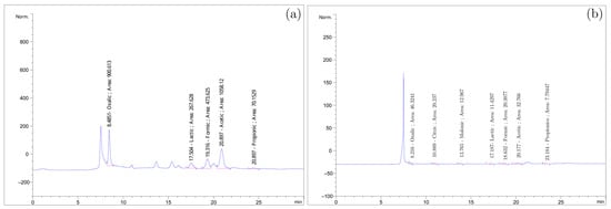 Characterization and quantification were performed using an Agilent 1100 Series High-Performance Liquid Chromatography (HPLC) system with a UV/Vis detector and a SUPELCOGEL H column for organic acid detection (Agilent Inc., Santa Clara, CA, USA). The operating conditions were as follows: Injection volume: 20 μL; Flow rate: 0.5 mL/min; Mobile phase: 0.1% H3PO4 solution.