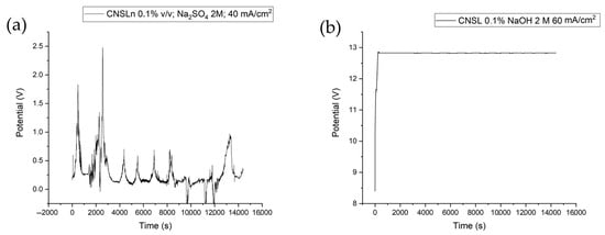 (a) Chronopotentiogram of experiments: NaOH 0.125 M, CNSLn 0.1% v/v, 60 mA/cm2; (b) NaOH 2 M, CNSLn 0.1% v/v, 60 mA/cm2.