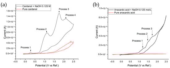 Cyclic voltammetry showed that the constituents of CNSL are not conductive by themselves at pure concentrations, requiring the addition of a supporting electrolyte (NaOH 0.125 M) to carry out the process (Figure 3). The CNSL constituents exhibited a common behavior characterized by the presence of three irreversible oxidation processes and the formation of a loop in the anodic wave (Figure 3).