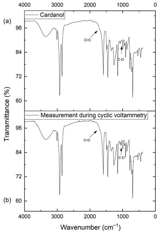 This technique was performed by cyclic voltammetry at 10 mV/s using a DropSens 110 screen-printed carbon electrode (Metrohm, Asturias, Spain), with cardanol mixed with NaOH and 25% ethanol in a 4:1 ratio. Simultaneously with cyclic voltammetry, infrared spectra were recorded using a PerkinElmer Spectrum Two IR spectrometer (PerkinElmer Inc., Shelton, CT, USA).