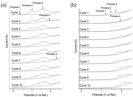 On the other hand, the phenomena observed in the spectrum and voltammogram allowed a more detailed study of the oxidation processes of the constituents by applying 10 scan cycles at 20 mV/s. The results of this characterization are shown for both constituents, displaying similar behavior (Figure 6).
