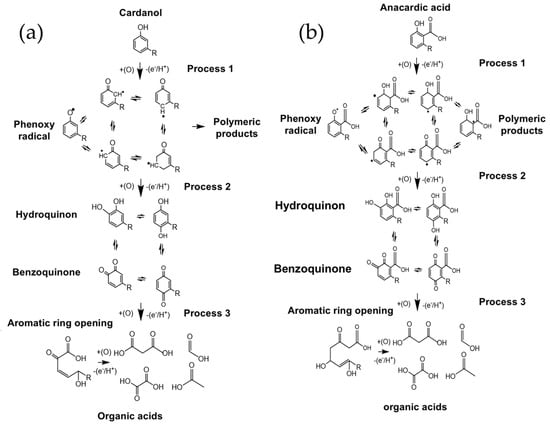 Scheme of the oxidation reactions of (a) cardanol and (b) anacardic acid, into low molecular weight organic acids and polymeric material.