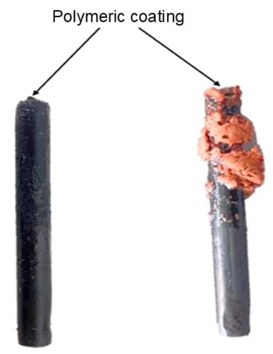 The characterized material corresponded to the polymeric layers formed on the working electrode surface. It was observed that in experiments with CNSLt, these layers appeared as a thin, dark-colored coating, unlike the experiments with CNSLn, which exhibited a copper-colored crust (Figure 8).