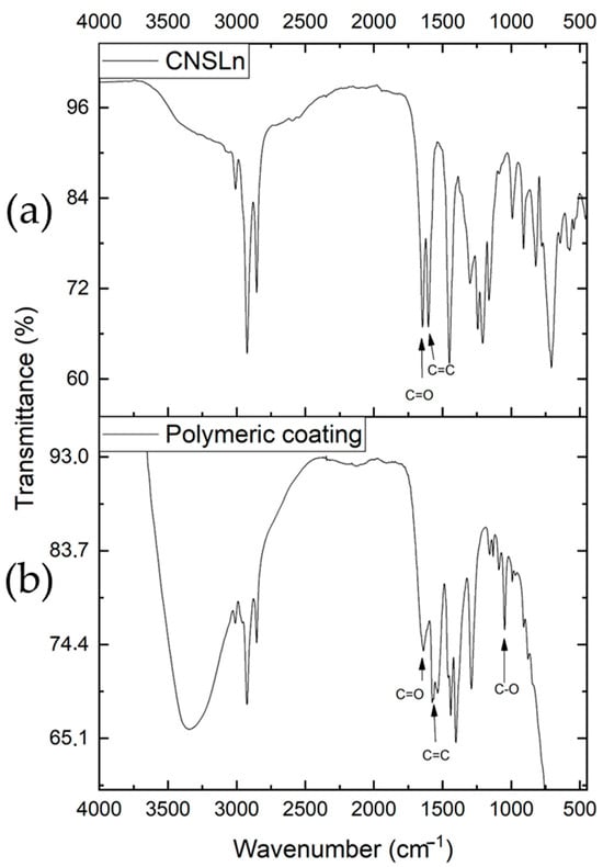 On the other hand, the polymeric material derived from CNSLn in the infrared spectrum shows the functional groups of anacardic acid (Figure 10). It also exhibits a peak in the 1046 cm−1 region corresponding to the C–O bond. These types of polymers pose limitations for the formation of organic acids, but they may also represent a research field regarding insulating coatings and their properties.