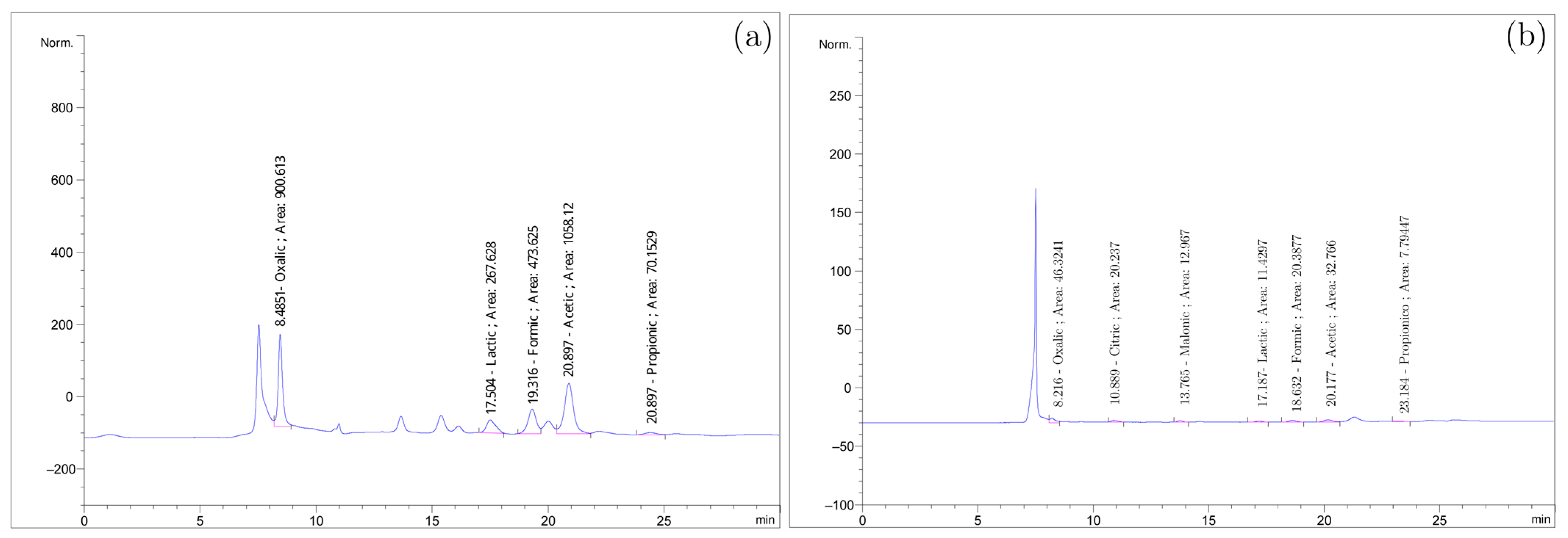 | % v/v | % v/v | Na2SO4 | NaOH | mA cm−2 | Citric Acid | Propionic Acid | Malonic Acid | Oxalic Acid | Lactic Acid | Formic Acid | Acetic Acid |