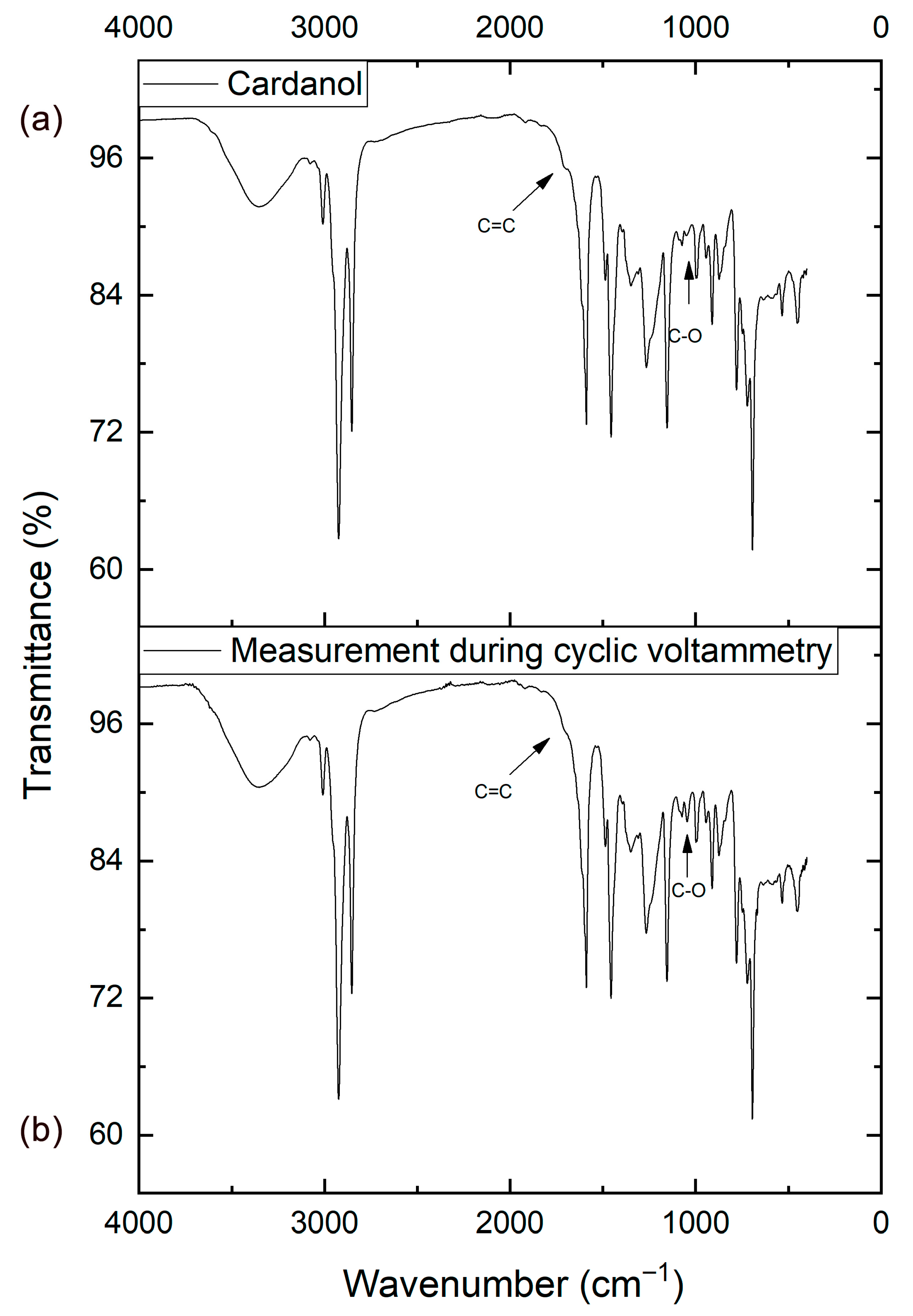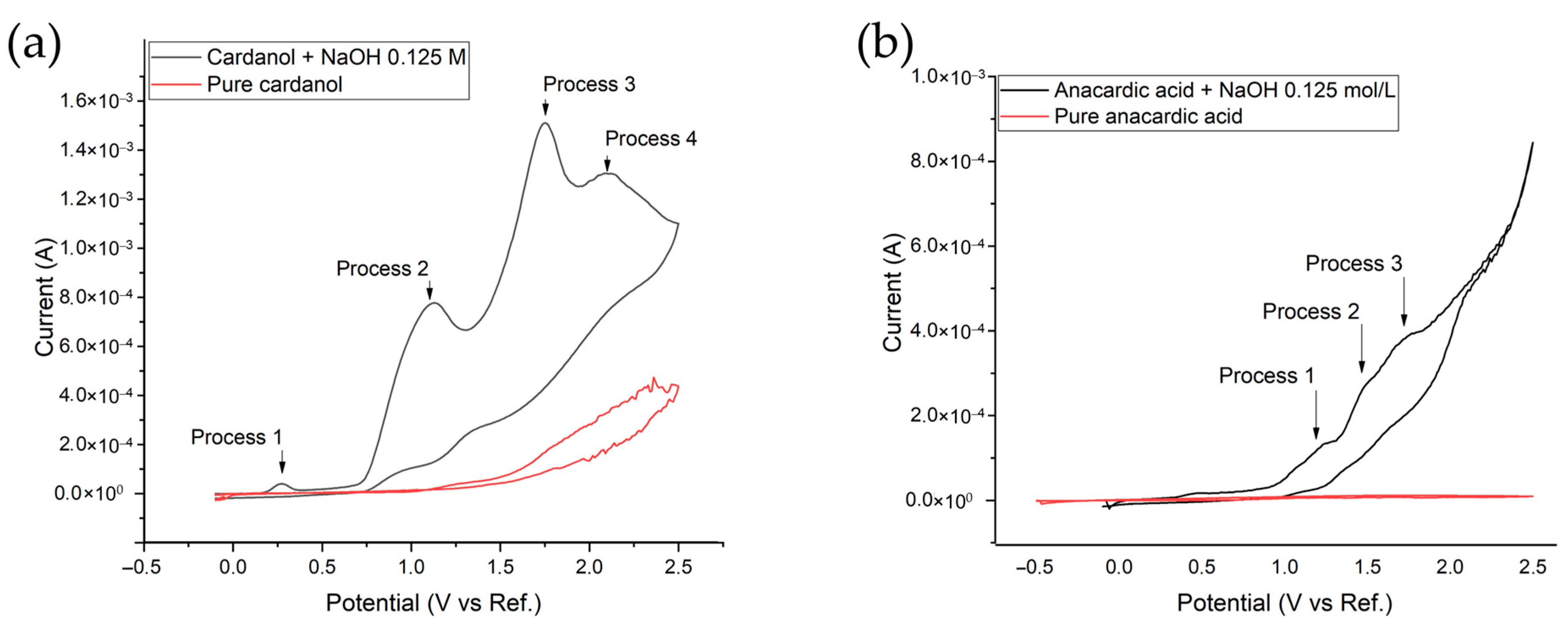 - Maia, F.; Clemente, C.; Oliveira, T.; Lomonaco, D.; Oliveira, T.; Almeida, M.; De Lima, P.; Correia, A.; Mazzeto, S. Electrochemical and computational studies of phenolic antioxidants from cashew nut shell liquid. Electrochim. Acta. 2012, 79, 67–73. [Google Scholar] [CrossRef]