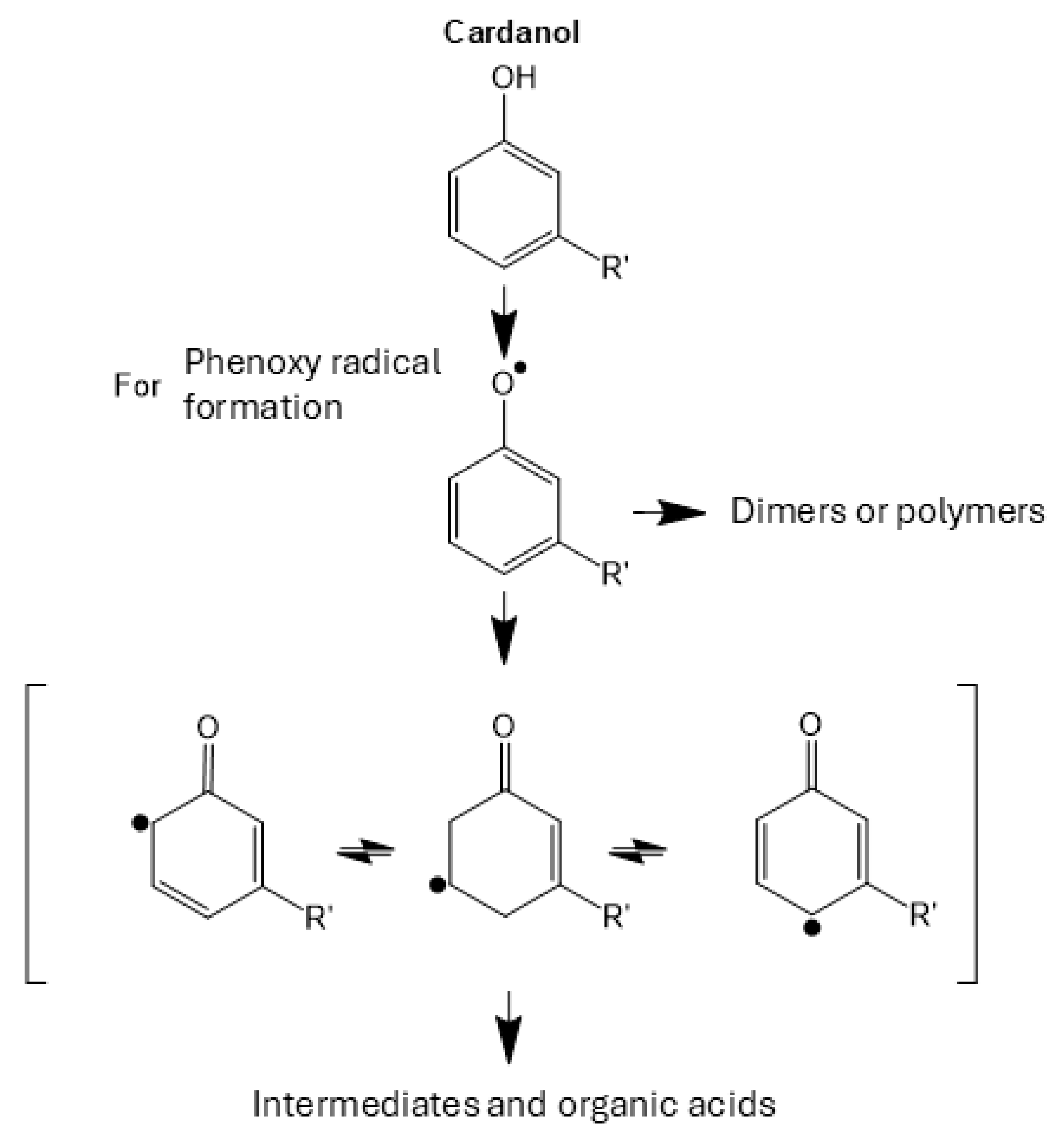 - Phani Kumar, P.; Paramashivappa, R.; Vithayathil, P.J.; Subba Rao, P.V.; Srinivasa Rao, A. Process for isolation of cardanol from technical cashew (Anacardium occidentale L.) nut shell liquid. J. Agric. Food Chem. 2002, 50, 4705–4708. [Google Scholar] [CrossRef]