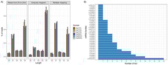 Overview of sRNA-Seq data in Arachis stenosperma roots infected with Meloidogyne arenaria: (A) Percentage of reads mapped to the A. duranensis reference genome from A. stenosperma infected (AsINOC—shades of blue) and control (AsCTR—shades of red) libraries: (i) total mapped reads between 20 and 24 nt; (ii) uniquely mapped reads; and (iii) ambiguously mapped reads (B) Number of miRNA loci per miRNA family identified in A. stenosperma.