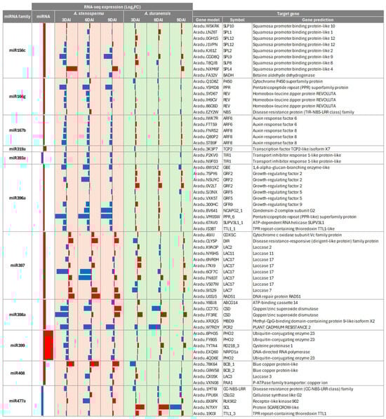Heatmap of the RNA-Seq expression (Log2 FC) of A. stenosperma miRNAs and their target genes in the RKN resistant A. stenosperma and the more susceptible A. duranensis. Colum: (1) miRNA identity; (2) miRNA expression (Log2 FC); (3–8) RNA-Seq expression (Log2 FC) of target genes at three time-points (DAI) after M. arenaria inoculation in A. stenosperma (3, 6 and 9 DAI); (8–10) RNA-Seq expression (Log2 FC) of target genes at three time-points after M. arenaria inoculation in A. duranensis (3, 6 and 9 DAI); (9) miRNA target gene identity (ID) in A. duranensis; (10) symbol; (11) target gene annotation (https://www.peanutbase.org/, accessed on 29 October 2025).