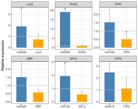 Representatives of six DEM families in A. stenosperma (miR156, miR166, miR319, miR396, miR399 and miR408) and their respective target genes had their expression behavior in silico validated by qRT-PCR analysis. For that, we used total RNA from A. stenosperma roots infected with M. arenaria at 6 DAI, which is the inflection time point of most RKN-responsive genes [], and specific primers for each miRNA according to Varkonyi-Gasic et al. [] (Supplementary Table S4). In addition to belonging to different conserved families, these DEMs were selected as their predicted target genes are well-known to be involved in response to stress, regulating different metabolic and regulatory pathways []. For instance, miR156, which target is a squamosa promoter binding protein-like 2 (SPL2), is involved in stress signaling and plant developmental process [,], miR166 targeting pentatricopeptide repeat (PPR)-like superfamily protein, is involved in biotic and abiotic stress [], miR319, targeting transcription factor TCP2-like, is involved in leaf development and biotic stress responses [,], miR396, targeting RNA-binding protein (RBP), is implicated in miRNA binding and biogenesis [], miR399 targeting ubiquitin-conjugating enzyme (PHO2), has a role in phosphate homeostasis and virus defense response [,] and miR408 targeting laccase genes (LAC3), which are enzymes involved in oxidation of phenolic compounds, lignin biosynthesis, copper homeostasis, and defense responses [].